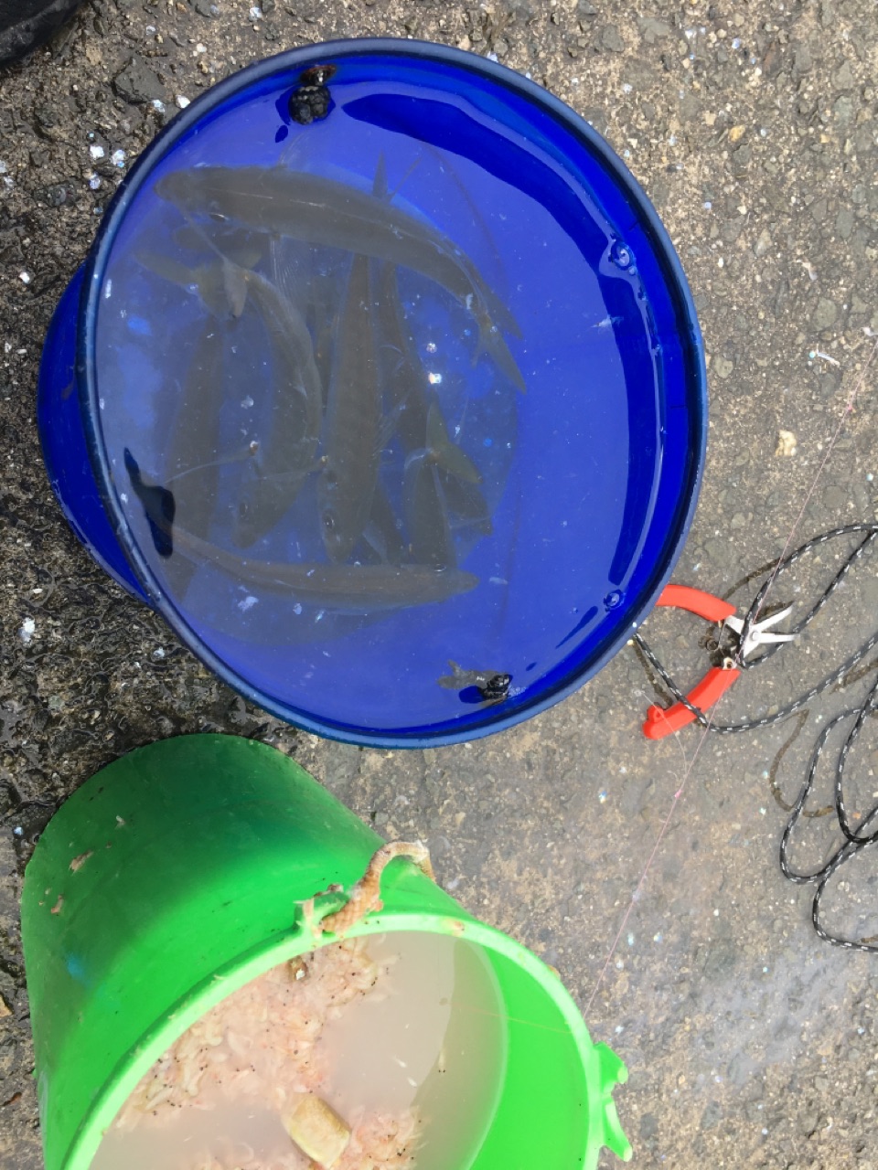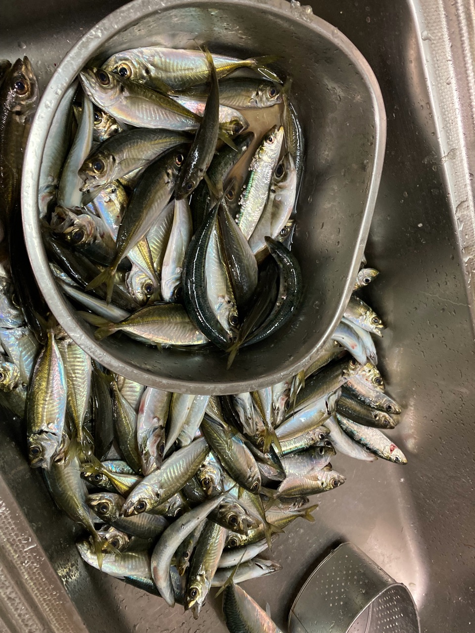 50分ほど自転車をこいでやっとの思いで釣り場に着くともうすでにアジやらイワシやらでなんと大爆釣!