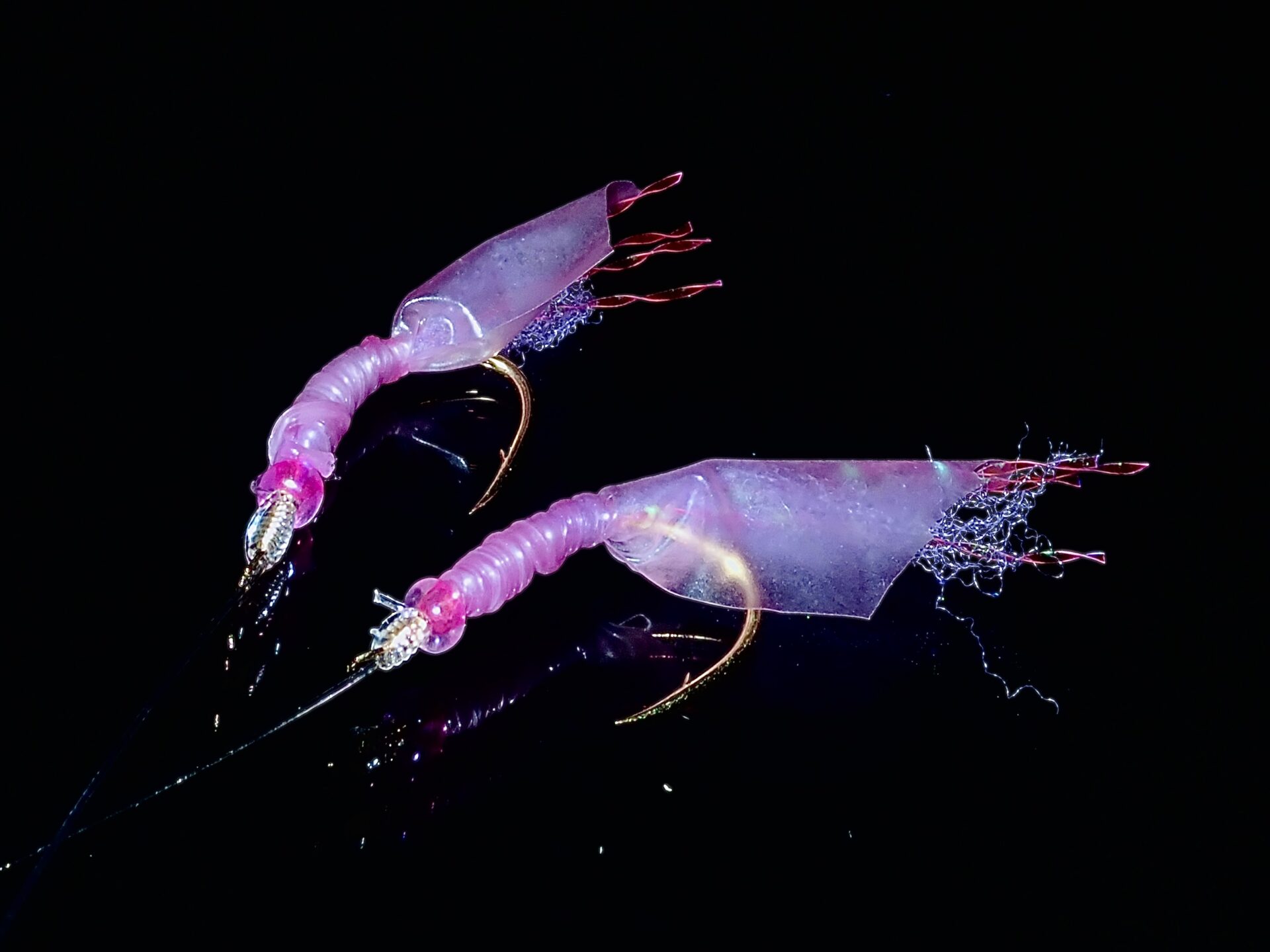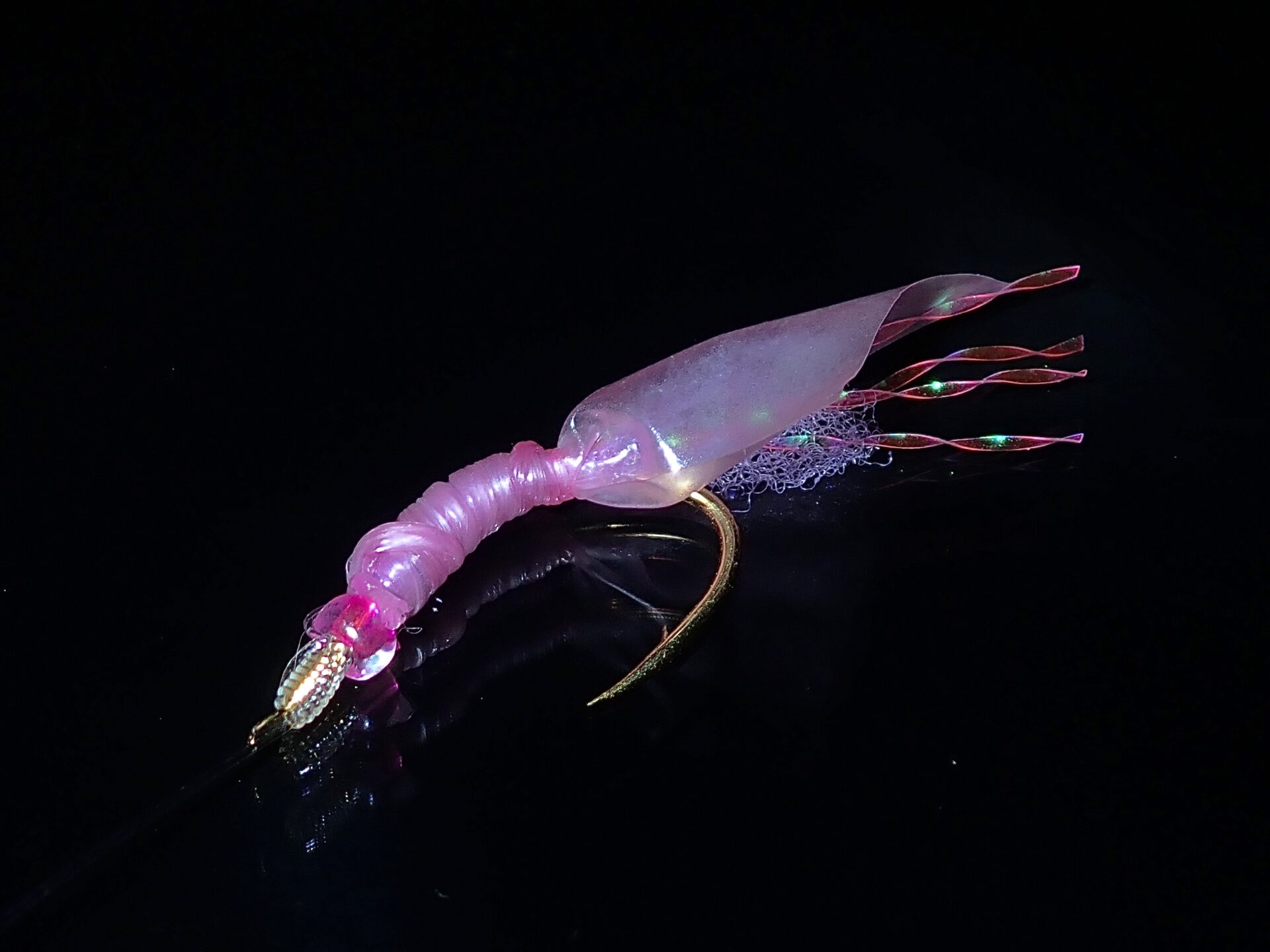 コメント:2025/02/06に制作した。新型の疑似餌。白いウイリーとピンクスキンを組み合わせたサビキ。ボリューム感がしっかりとある疑似餌となっている。量産予定。
