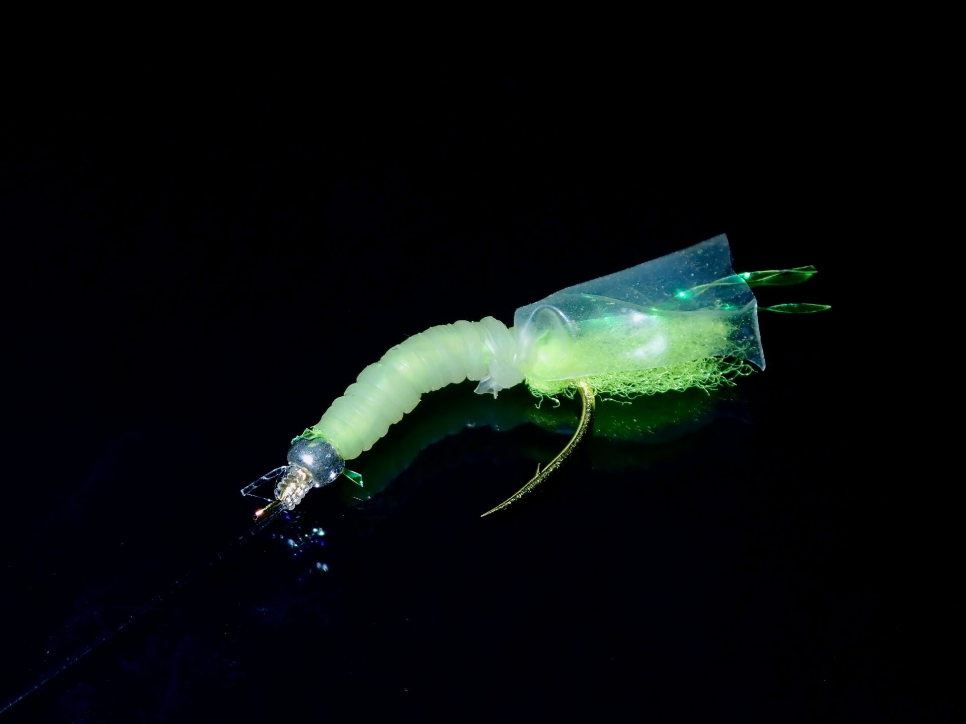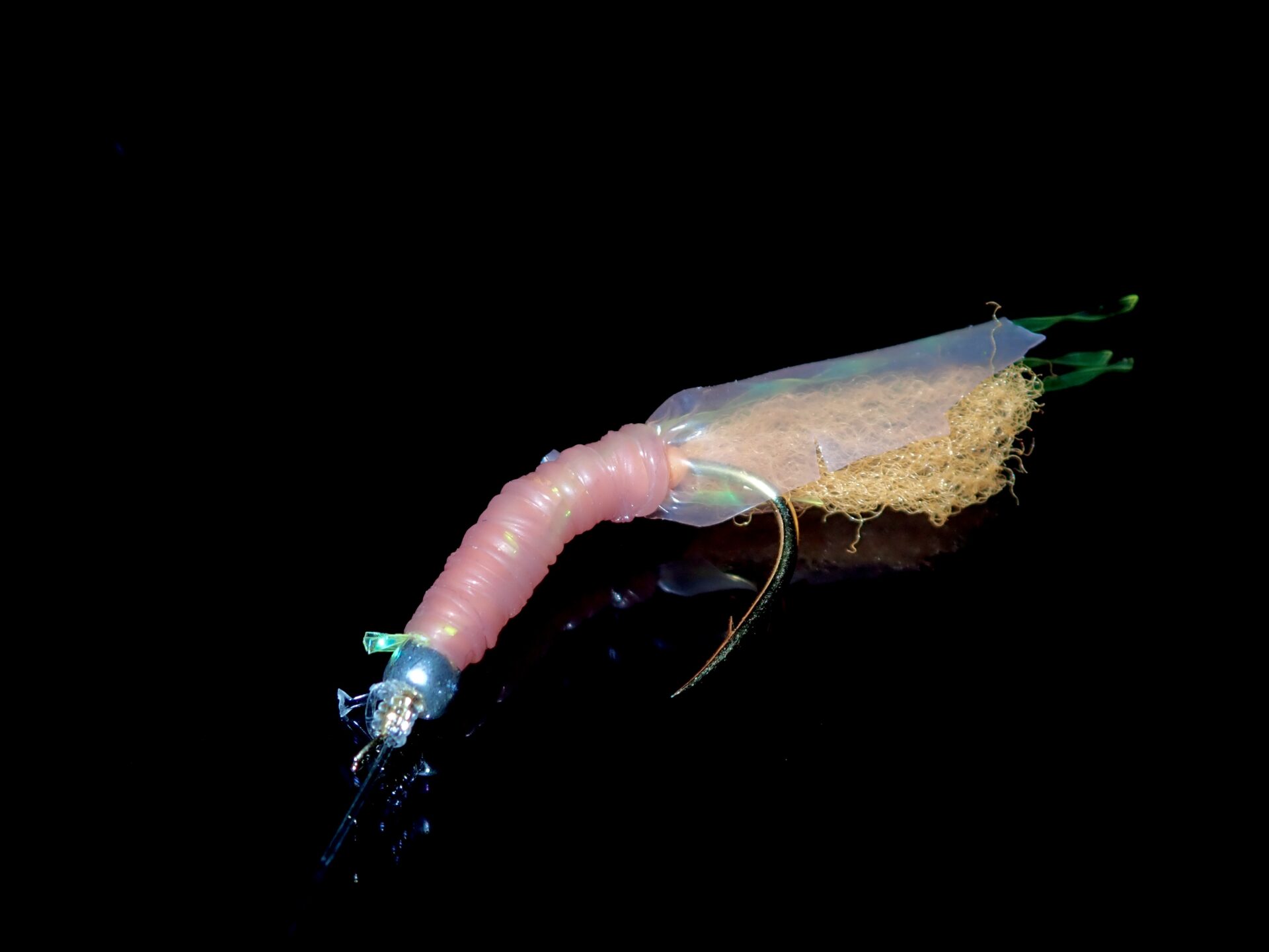コメント:2025年に作成した新作。ビニール袋と緑系のフラッシャーの合わせ技でシラスを表現する。材料費も従来のサビキと比較して同じ、もしくは下回るため量産体制に入った。いずれこのサビキの制作動画をYoutubeに投稿する予定。