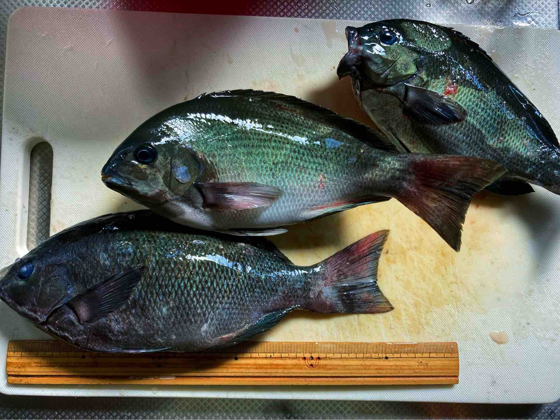 例えばよく釣れるのがグレ(メジナ)です。30センチまでのグレがよく青いそめにかかります。意外と糸が太くてもお構いなしにかかります。