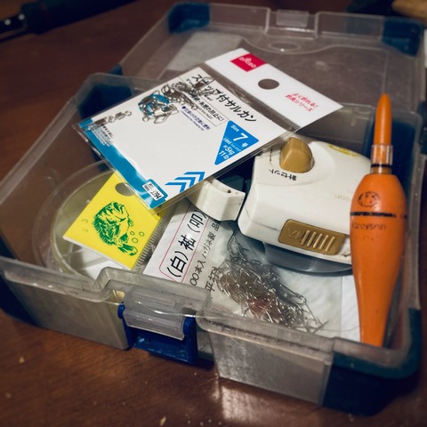 環付きの針を使うこともありますが大体はそれ以外の針です。夜間に手で結ぶのは結構めんどくさいのでいつもこれで結んでいます。元々はサビキ仕掛けを作るのに購入しましたが便利なので今ではこの釣りでも多用しています。