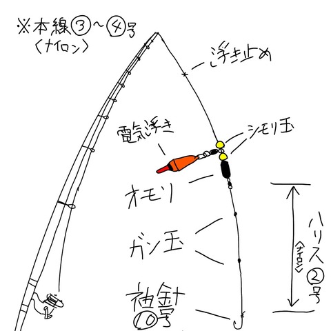一般的な浮き釣りの仕掛けと違って結構太い糸を使います。やはりガシラは根が荒いところにいるので根ずれが発生したりして糸が切れるのを防ぐためにこうしています。電気浮きについてですが小型の電気浮きなら使えます。太刀魚用のものは少し大きいと思うのでこれぐらい大きさのものを使うといいと思います。