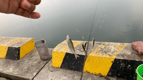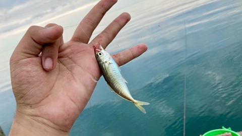 餌を撒くと大きなフグが多数集まってきて他にもボラも集まってきたので豆アジの群れがせっかく寄ったのに散り散りになってしまいました。なのでここからは海面に現れる波紋を頼りにあちこちを移動しながら数を稼ぎます。