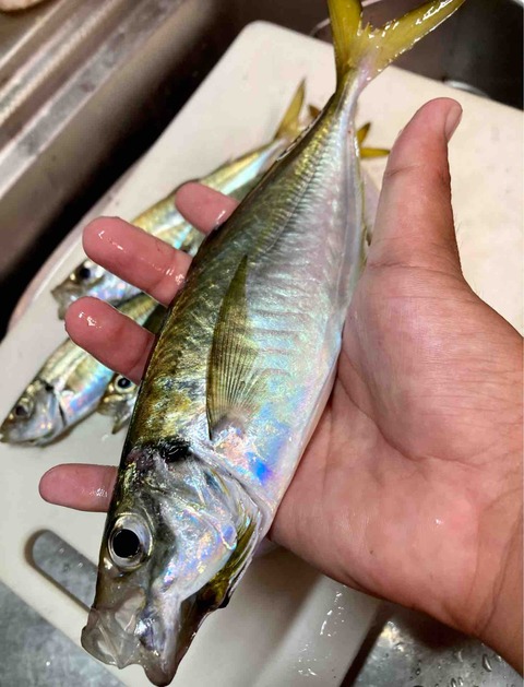 釣り上げた魚の魚体を確認すると!中アジでした!やったね