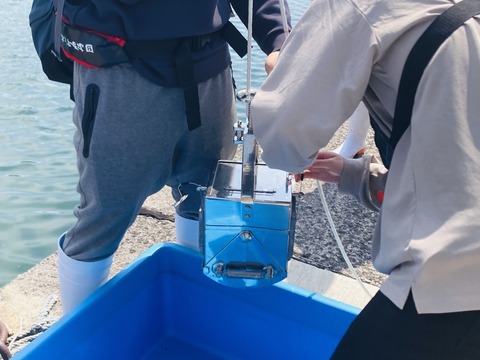 まず初めに実際に南あわじ市は阿那賀にあります阿那賀漁港から小さな漁船に乗船して水の透明度と海水を採取する作業を行います。