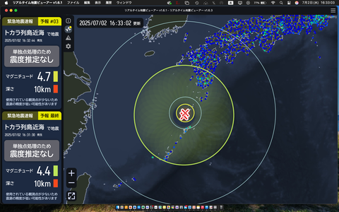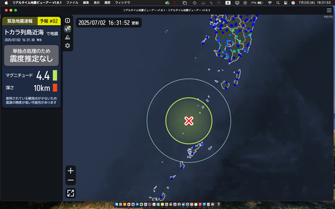トカラ列島は地震計の数が少なく処理ができないため震度測定なしとなっていますが日本のほとんどの場所ではこの時点で推定の震度が表示されています。