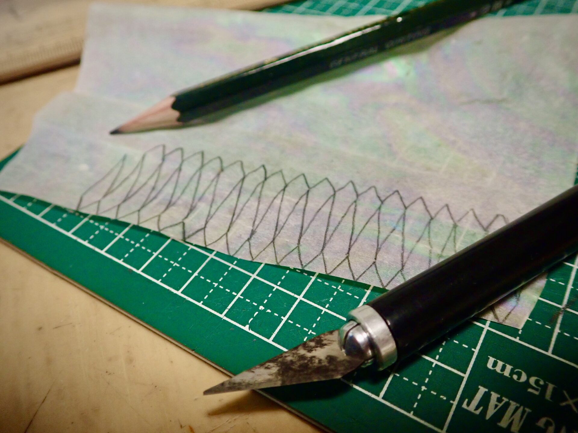 切れ味の良いデザインカッターと鉛筆。それからカッターを使用するので下に敷くマット的なものを用意します。