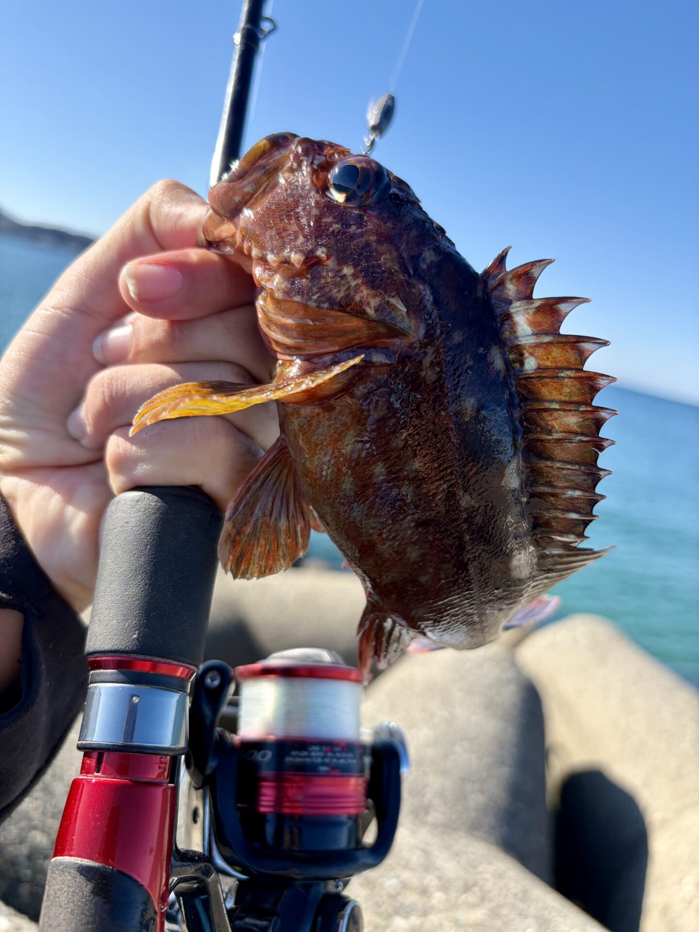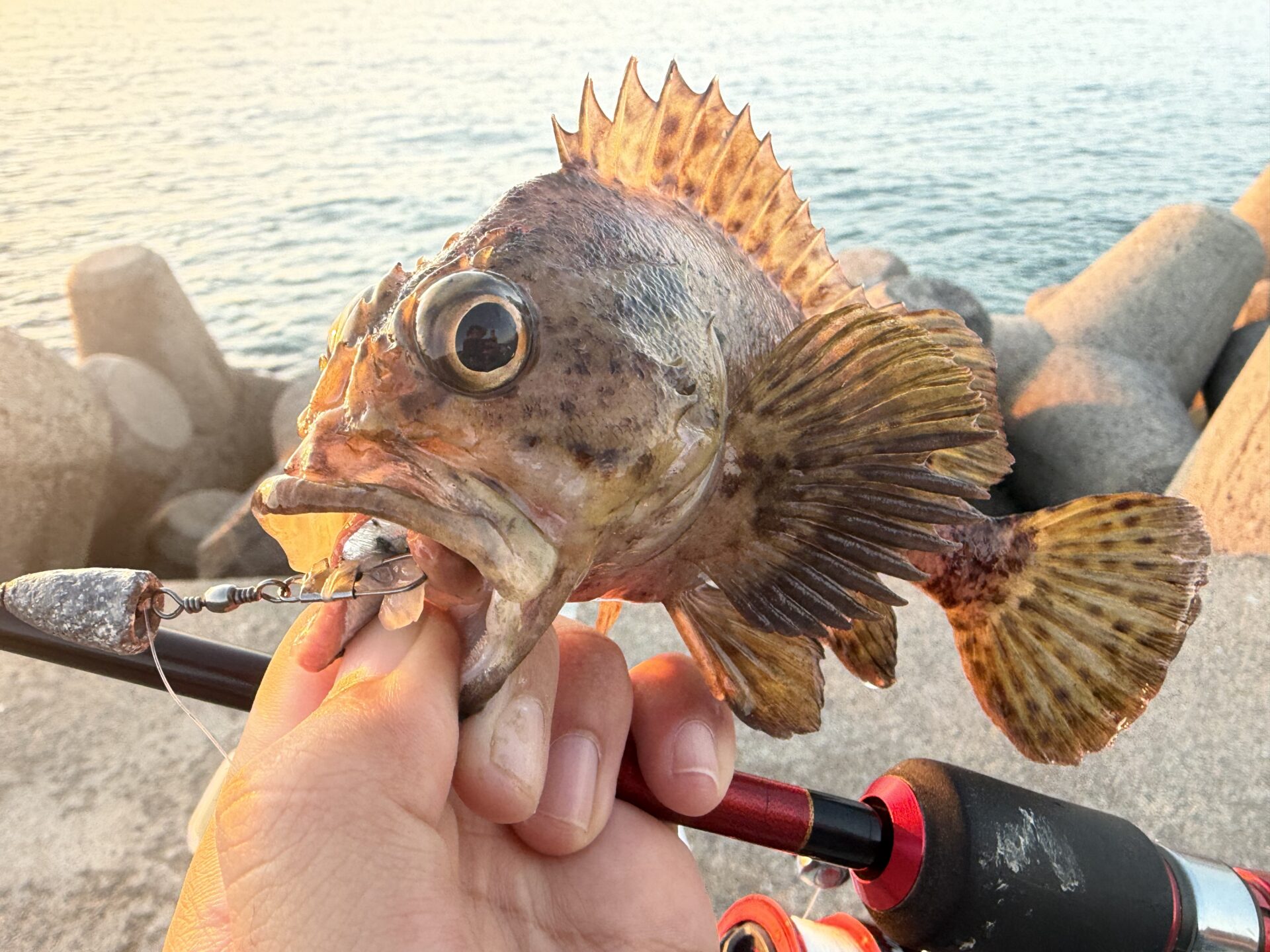 テトラのかなり奥側に位置する浅ーい穴を狙っているとようやくガシラがヒットしました!