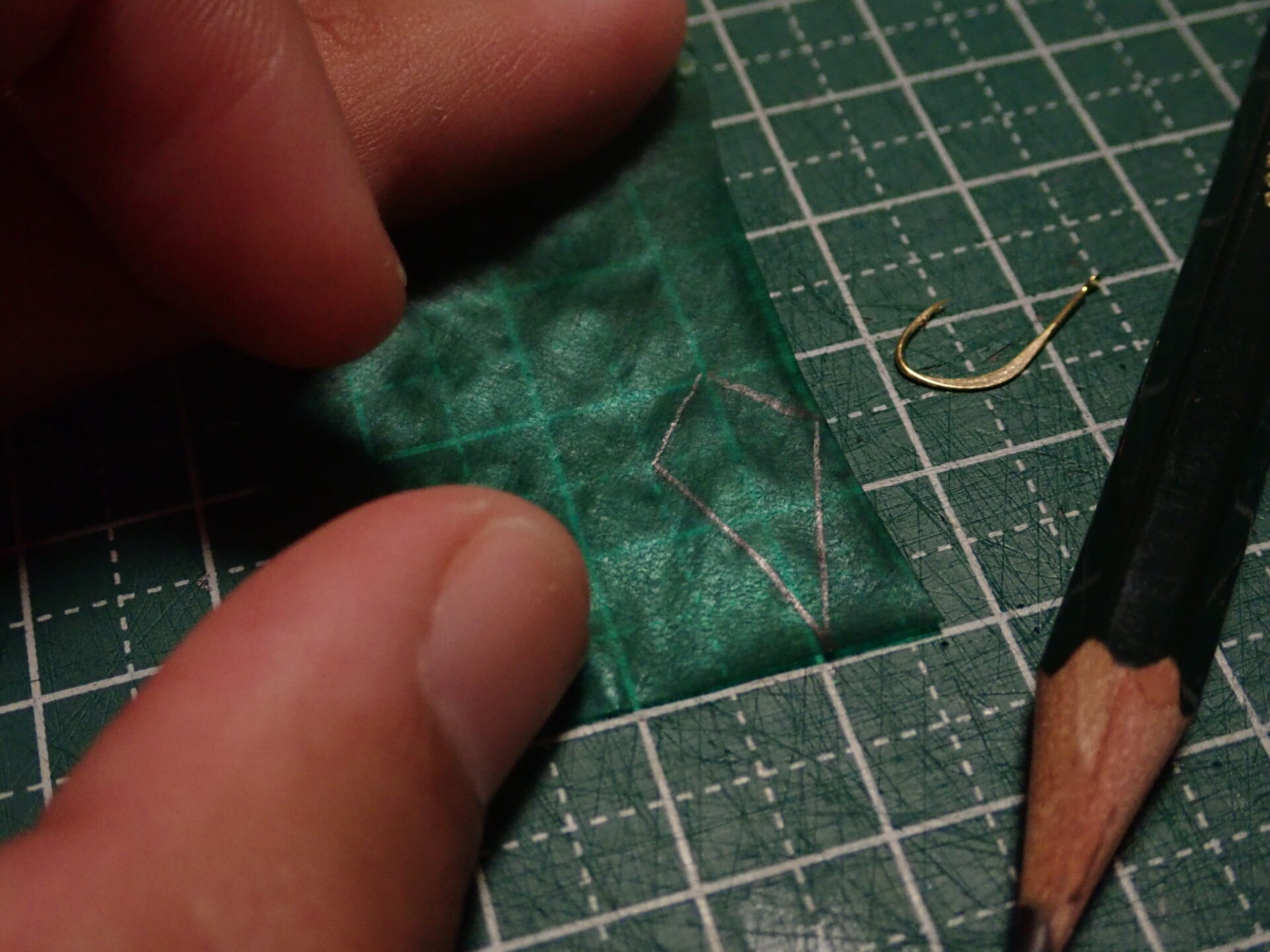 どのような形の擬似餌にするかの決定ができたら続いてはハゲ皮に鉛筆を使って切り出すための下書きを書いていきます。ハゲ皮を有効に活用するためにも私のように隙間がなるべく少なくなるような方法にしておくとロスが出にくくお得に使うことが可能です。