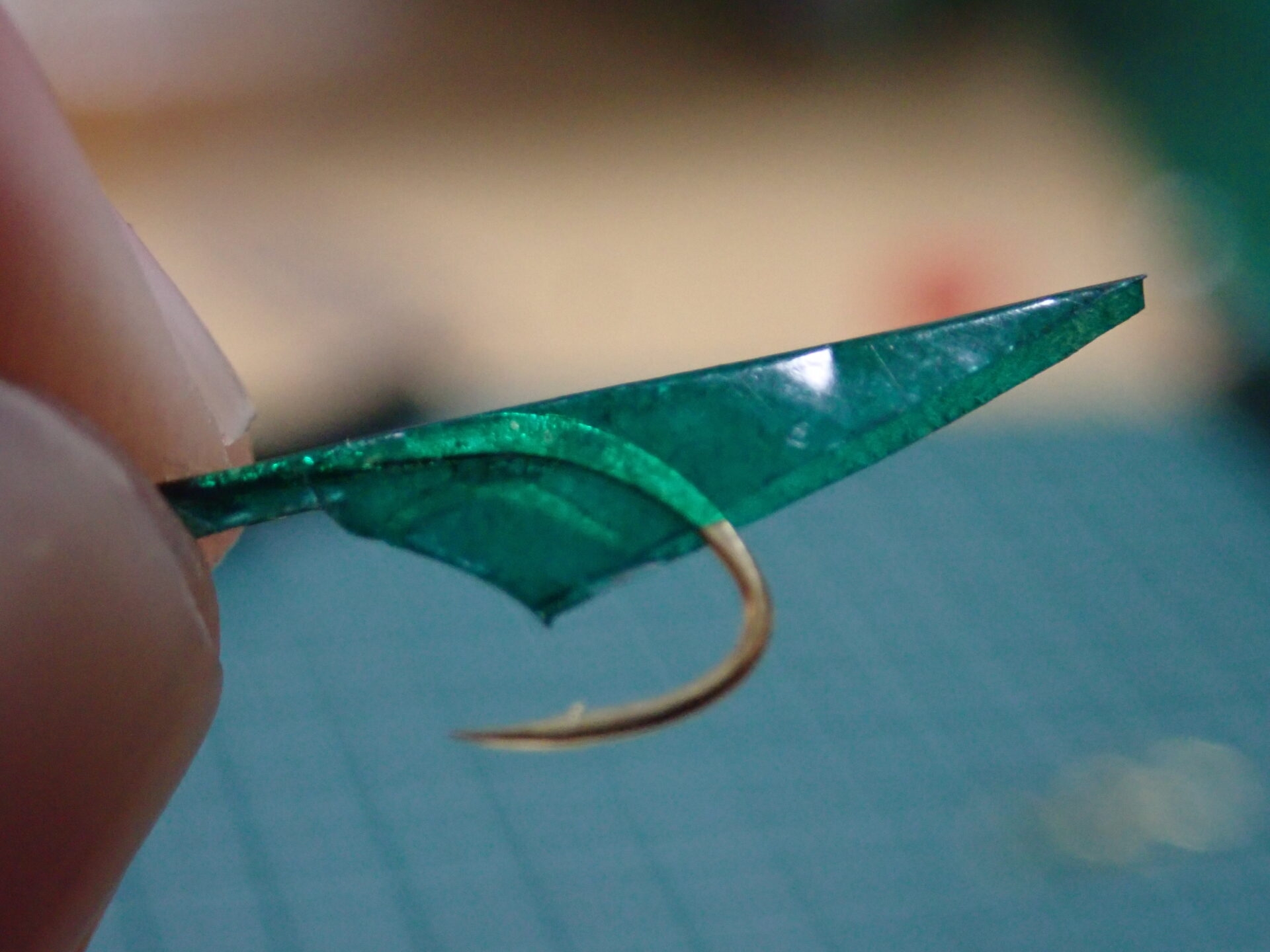 先ほど取り出した針を見ながら実際に後ほど接着する擬似餌部分のハゲ皮の大きさを決めていきます。