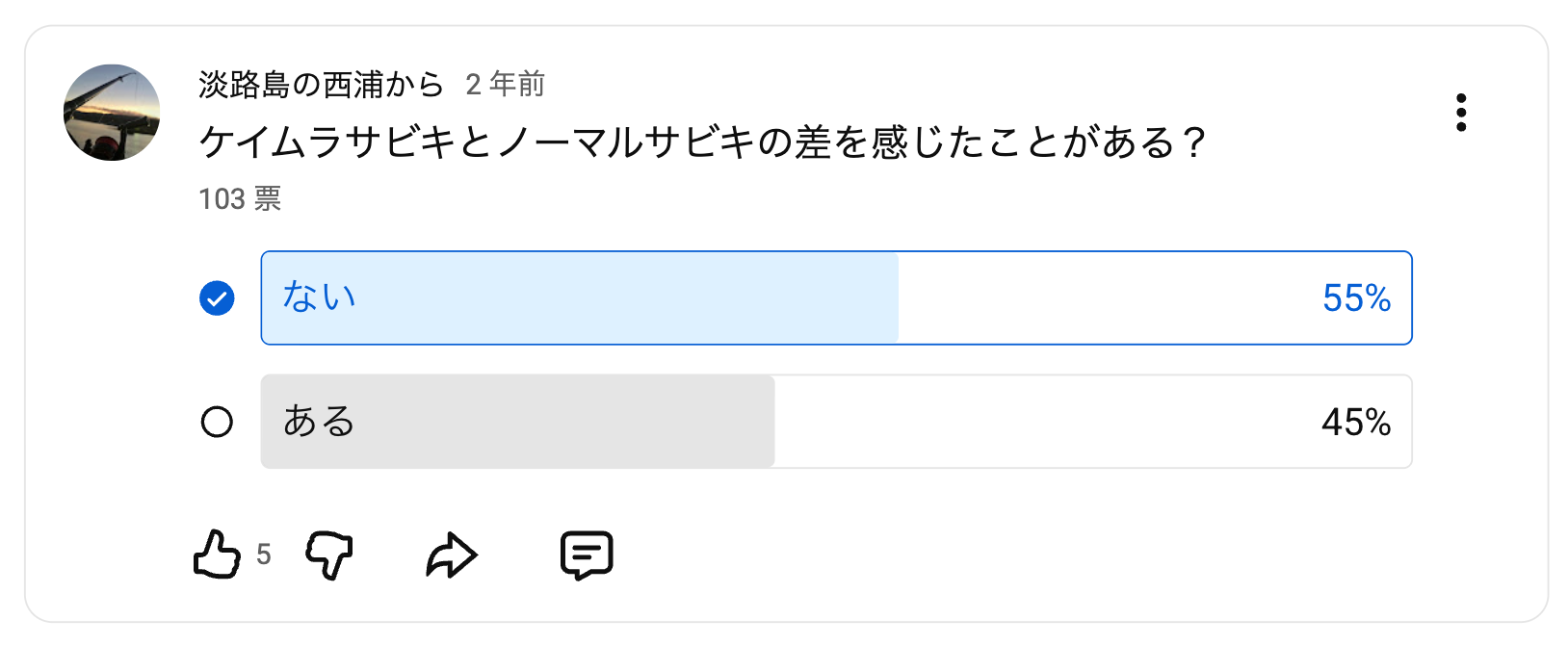 さらに、私が高校2年生だった時にはケイムラの有効性を感じているかどうかが気になったのでYoutubeのコミュニティでアンケートを実施した際には下記のように半分以上の方がケイムラの効果を実感したことがない。という回答を合計で100人以上の釣り人の方々から得ることができました。