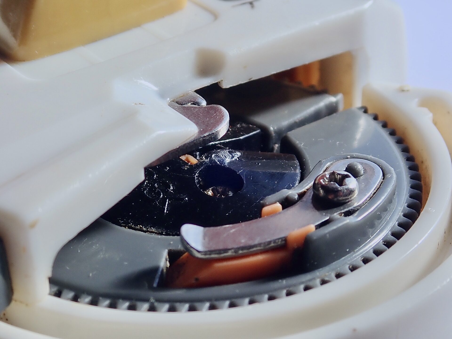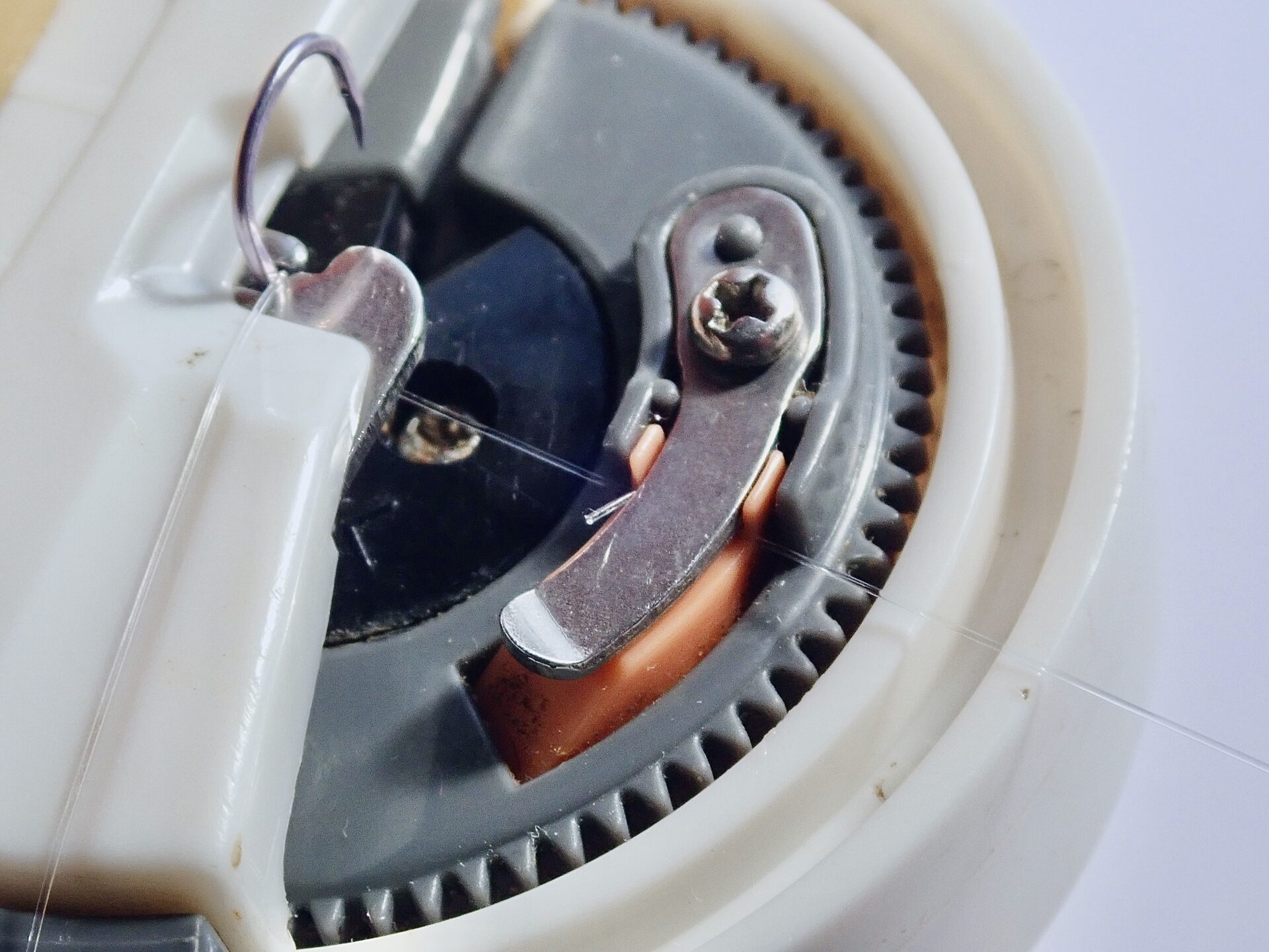 巻き作業がストップしたら下の写真の位置に、グレーのパーツを糸を引っ掛けたまま移動させてきます。