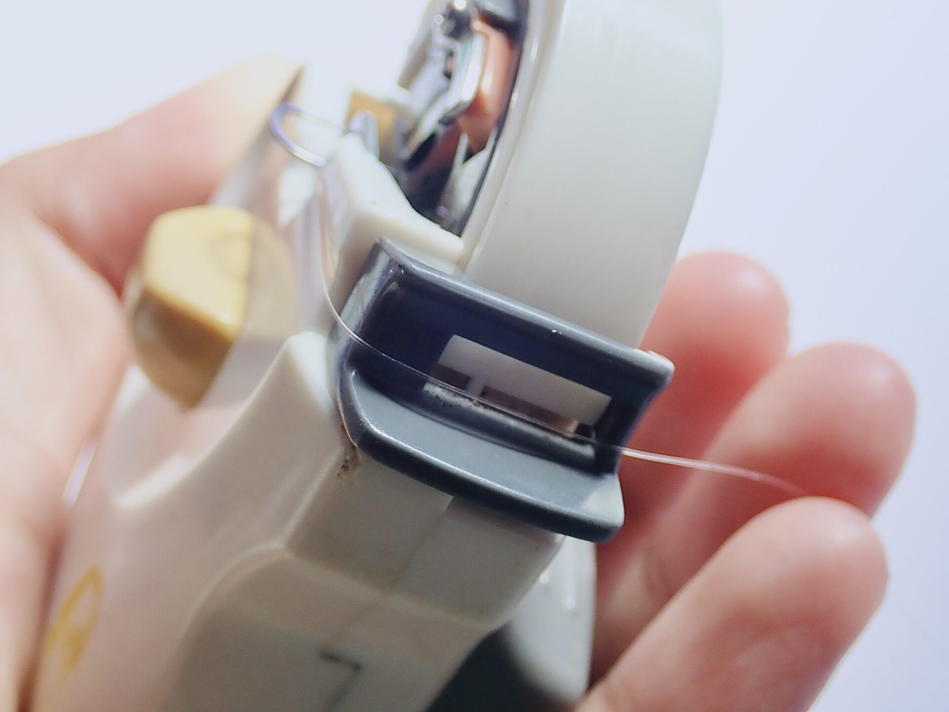 ここで再度針セットボタンをスライドさせ、針を摘み出すと一緒に金属パーツに挟まっている端糸も自然と取れるのでカットします。
