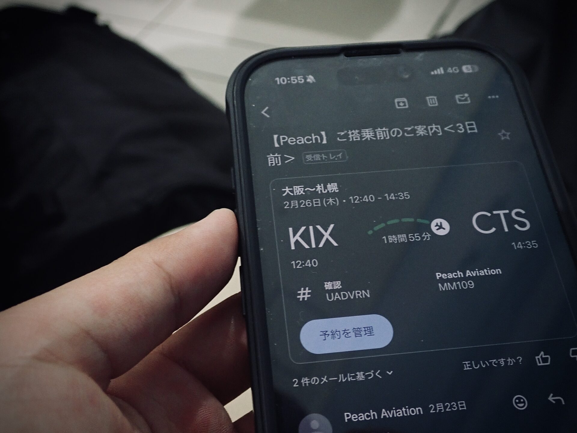 12:40 定刻通り飛行機は関西国際空港を出発、到着は新千歳です。